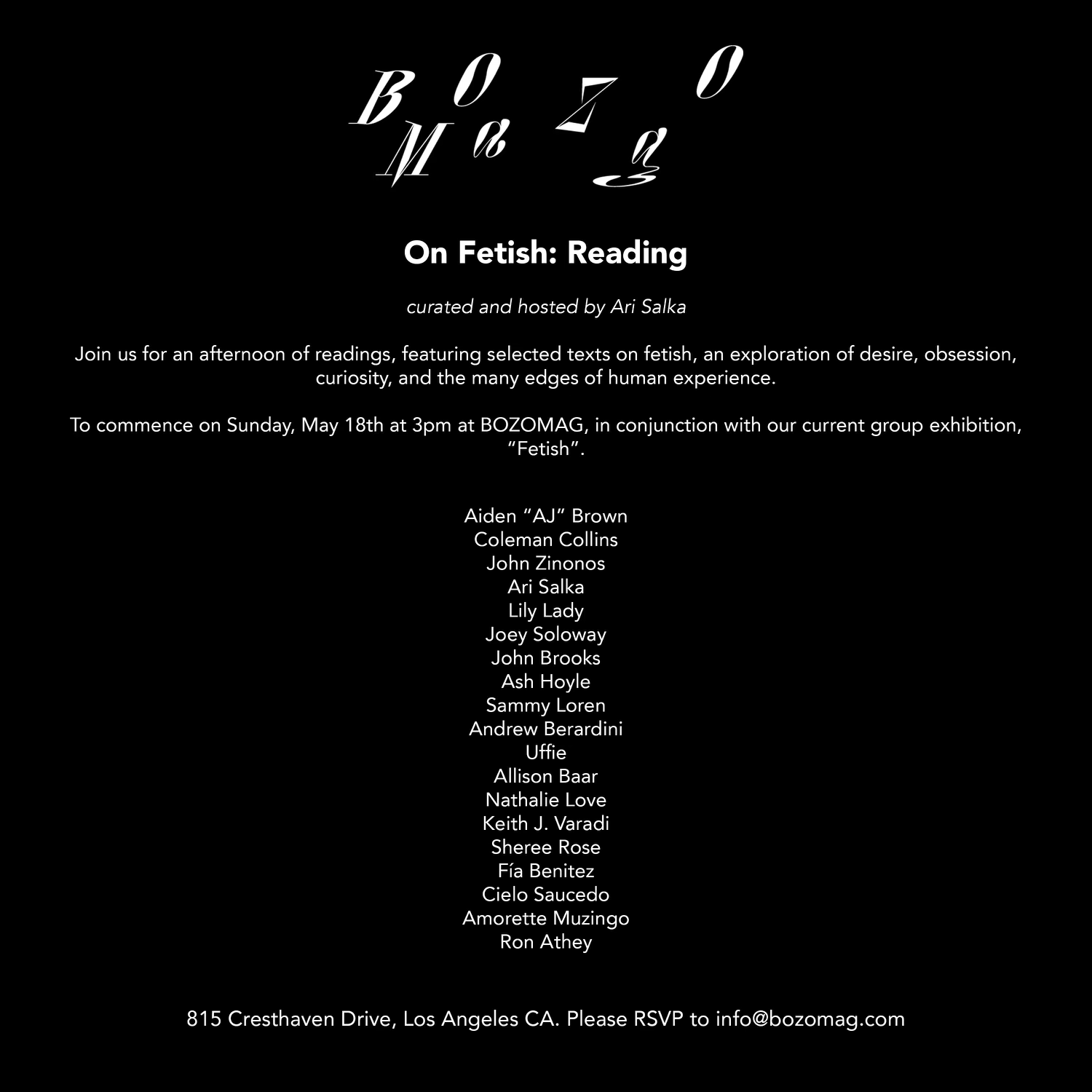Ari Salka curated and hosted the reading On Fetish in conjunction with the titular exhibition at Bozomag in Los Angeles, CA.